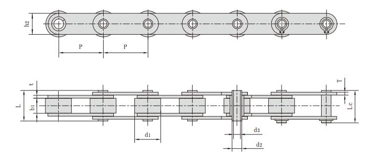 餅干輸送線,糕點輸送線,食品機械輸送線,主要選用不銹鋼雙節距空心銷軸鏈為主,圖中選用型號為C2042HPSS,中間連接桿總長度為640mm,連接桿直徑8mm,鏈條主要規格參數見下圖: