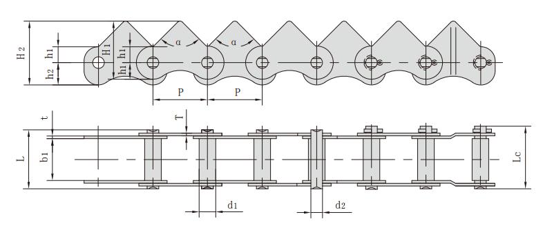 鏈號 節(jié)距 滾子直徑 內(nèi)節(jié)內(nèi)寬 銷軸直徑 銷軸長度 齒形角 鏈板厚度 鏈板尺寸 抗拉強度 平均抗拉強度